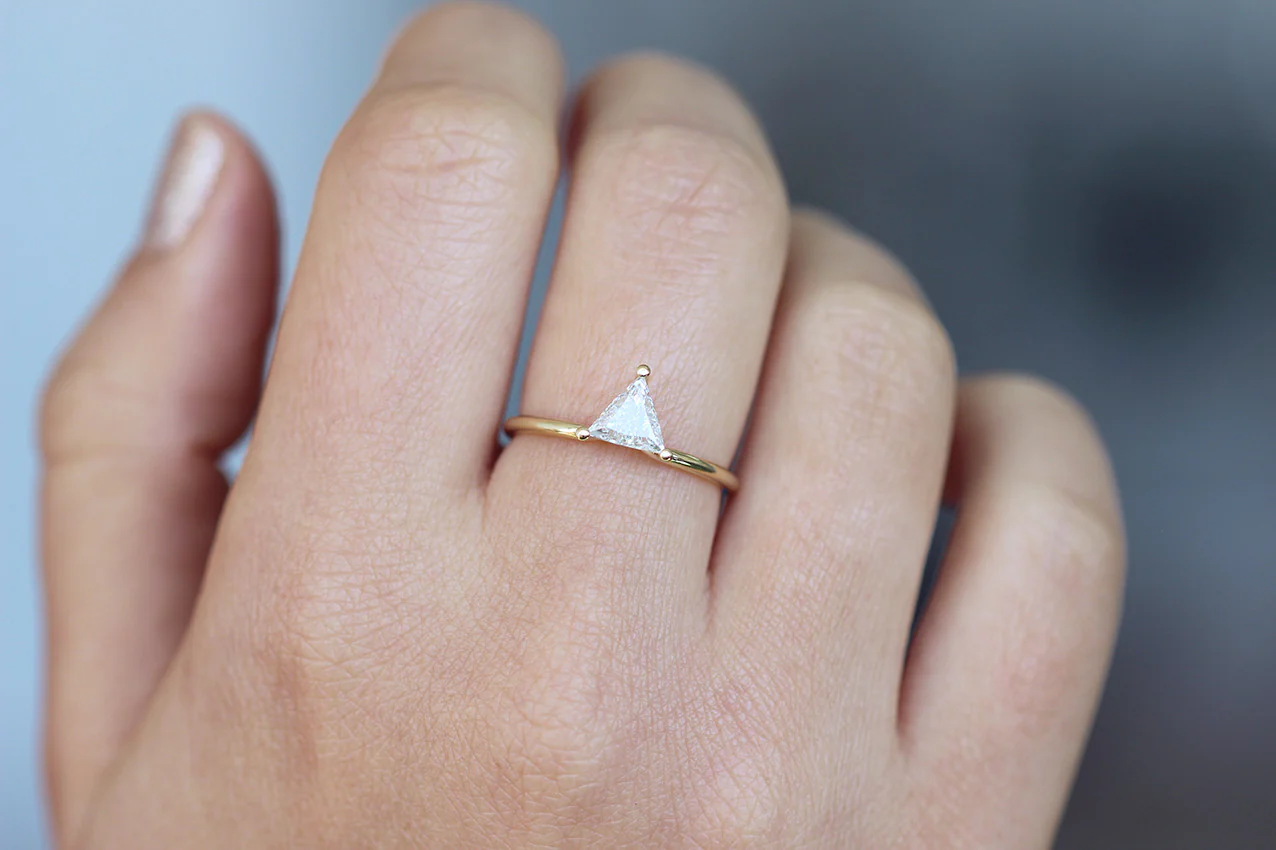 18k solid gold, ~0.5 carat trillion cut diamond, two 0.06 carat round cut diamonds