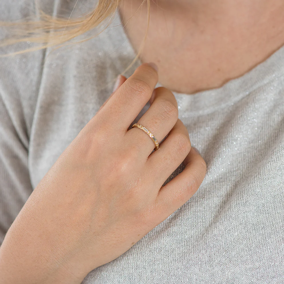 The Art Deco Diamond Wedding Band - Geometric Diamond Ring features a delicate array of multiple baguette cut diamonds and round diamonds in a stunning geometric pattern.