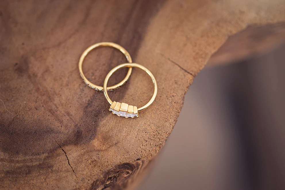 A dazzling bridal ring set featuring unique baguette cut diamond ring coordinated with a geometric pattern wedding band. This design combines a sleek style with romantic details.
