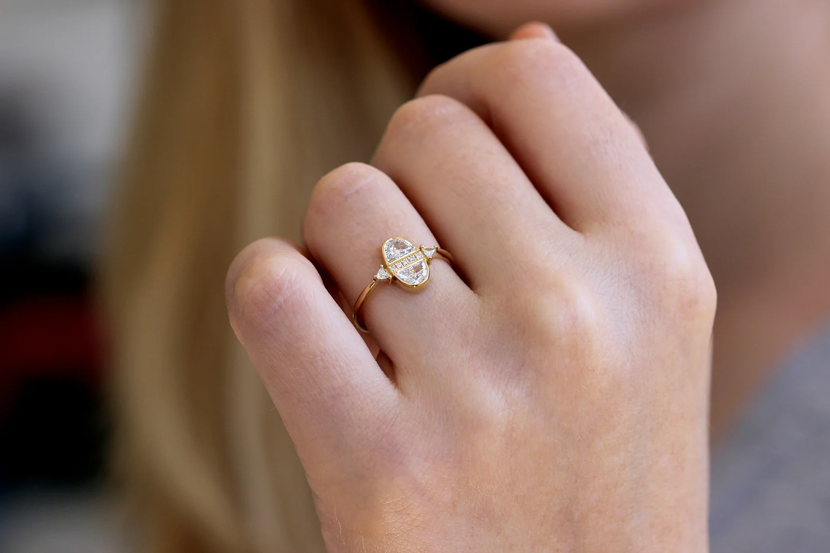 Diamond cluster engagement ring in 18k solid gold with a sparkly half moon and trillion diamonds.