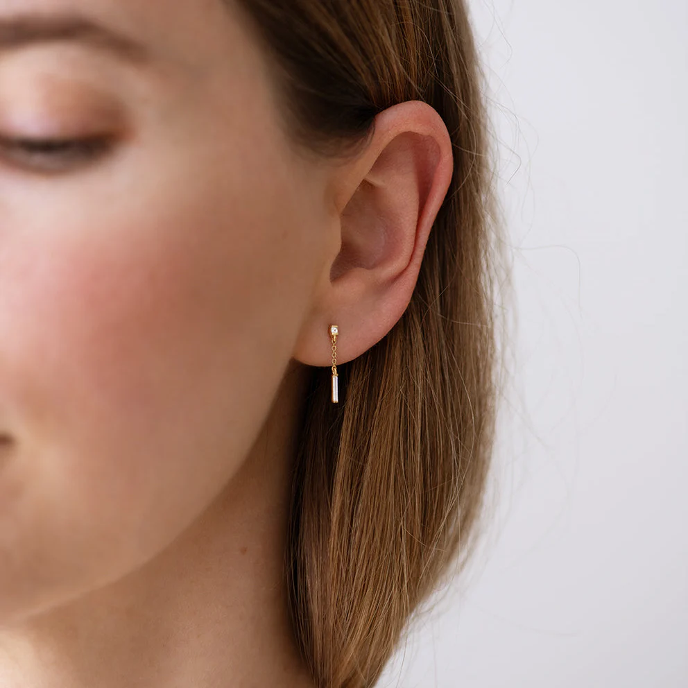 The baguette diamond drop earrings feature a petite square baguette diamond that drop into a radiant needle baguette diamond. These dainty earrings take a charming and unique spin on the art deco style, leaving a lasting and luminous impression.