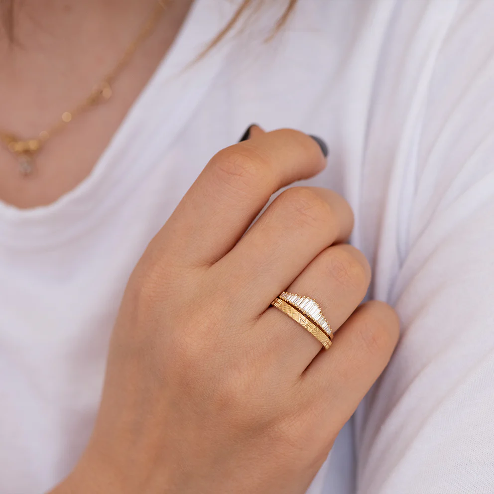 The baguette diamond wedding ring set features a gorgeous baguette engagement ring paired with a geometric engraved gold band. The elegant simplicity in the lineup of the baguette diamonds perfectly compliments the intricate patterns in the wedding band.