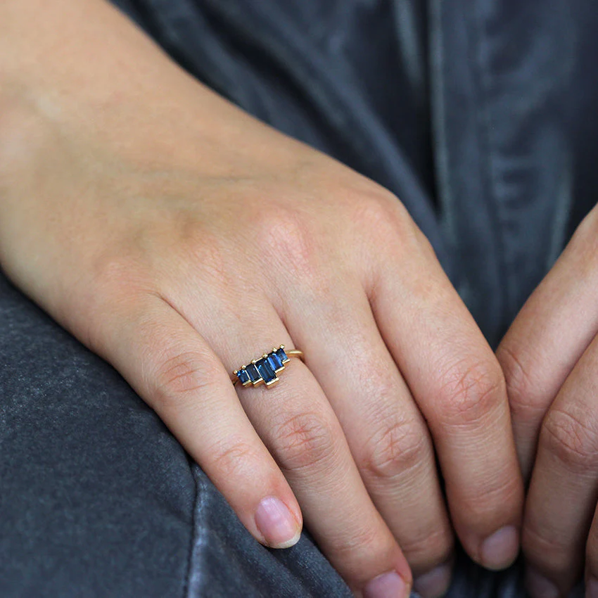 18k solid gold, five baguette cut sapphire gemstones in three different sizes // ~0.65Ā carat total.