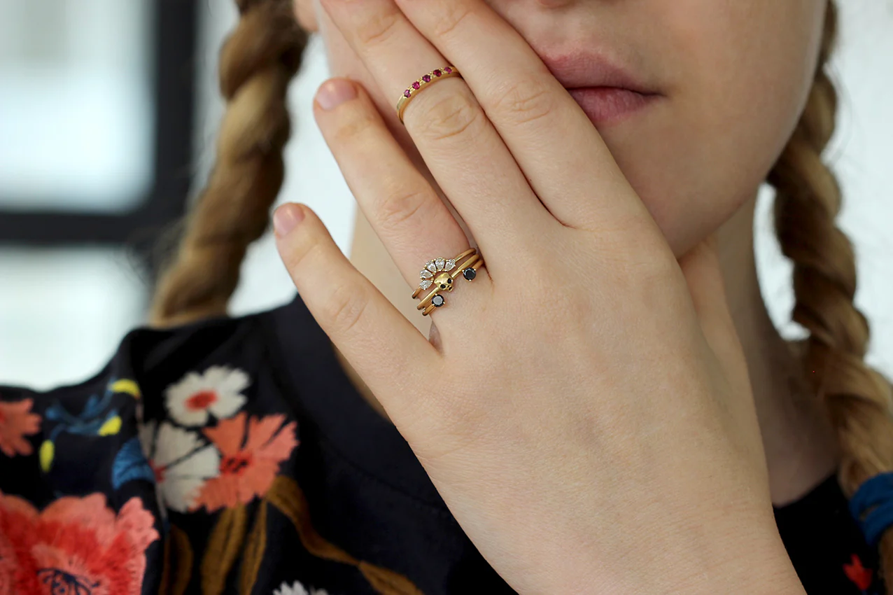 Cat skull wedding set with two round 1.2 mm black diamonds.