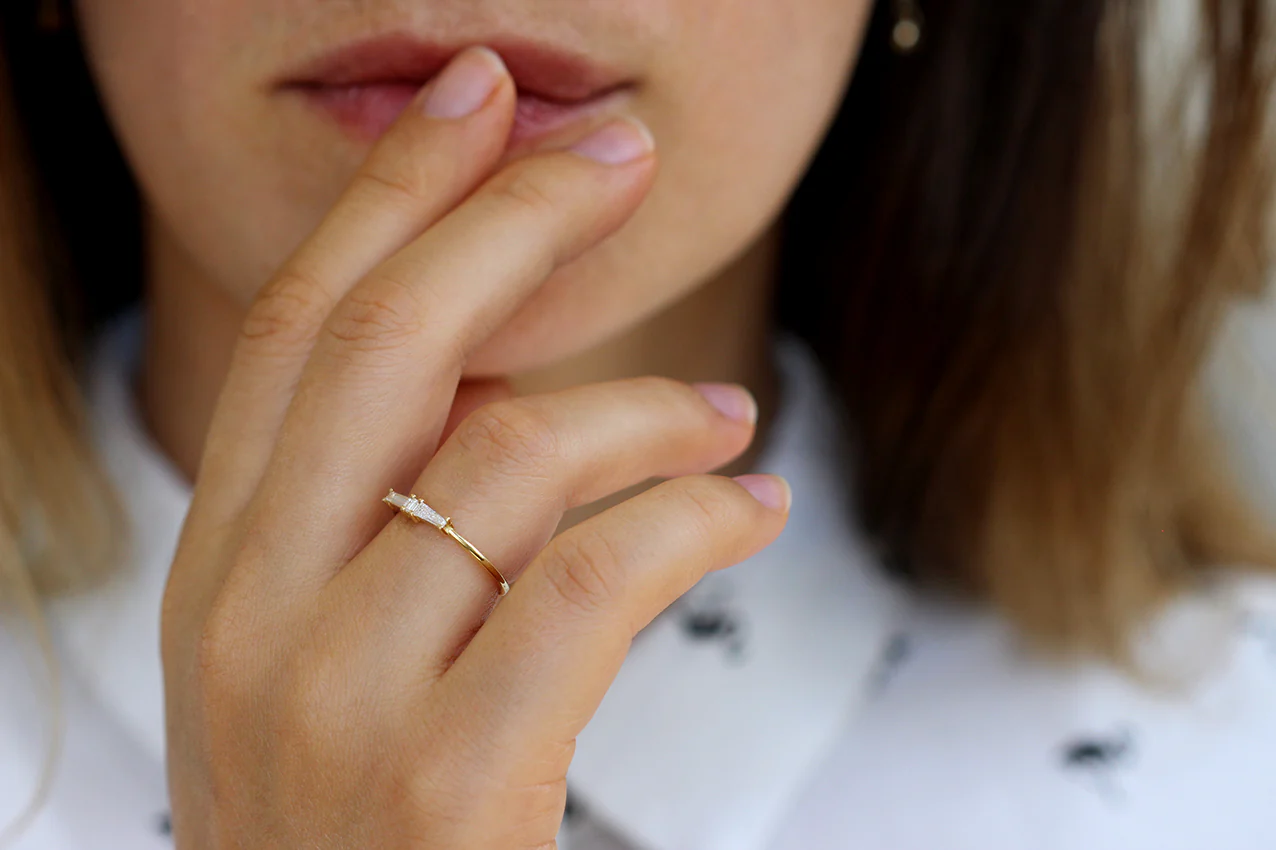 18k solid yellow gold | center diamond 0.05 carat carre cut | two 0.10 carat tapered diamonds - 0.25 total carat.Â