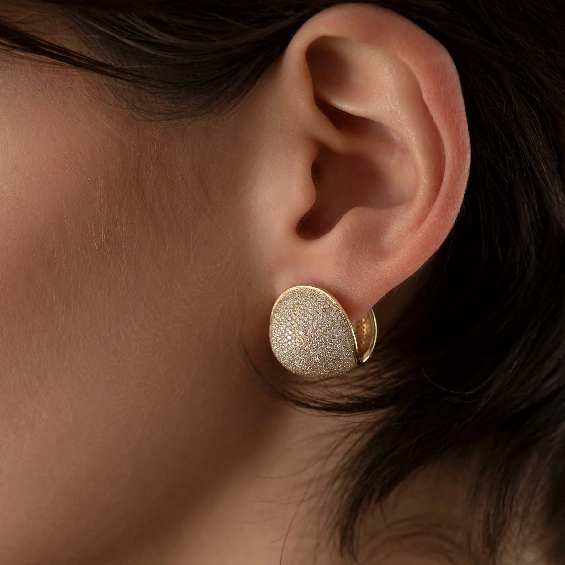 The Diamond Pave Chunky Ball Statement Earrings are handcrafted in our studio from 18K gold. In this design, brilliant pave diamonds encrust a gold ball, gently encasing your lobe in glittery stones and smooth metal. Whether worn with jeans and a crisp white T-shirt or a magnificent gown, these earrings add bold yet elegant sparkle to any look.Ā