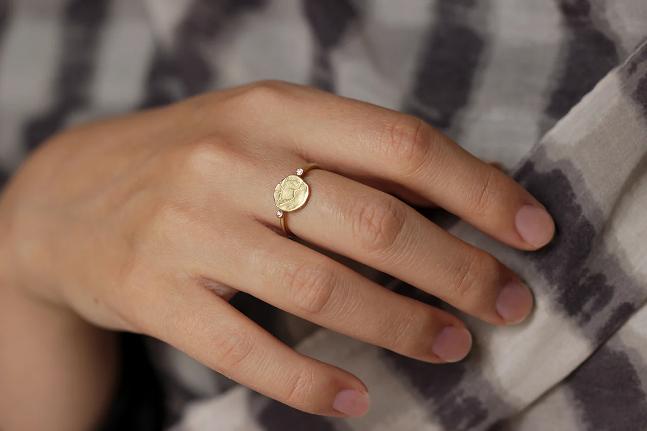 Gold signet ring in 18k solid gold with engraved Egyptian dog and snake, and two little diamonds.