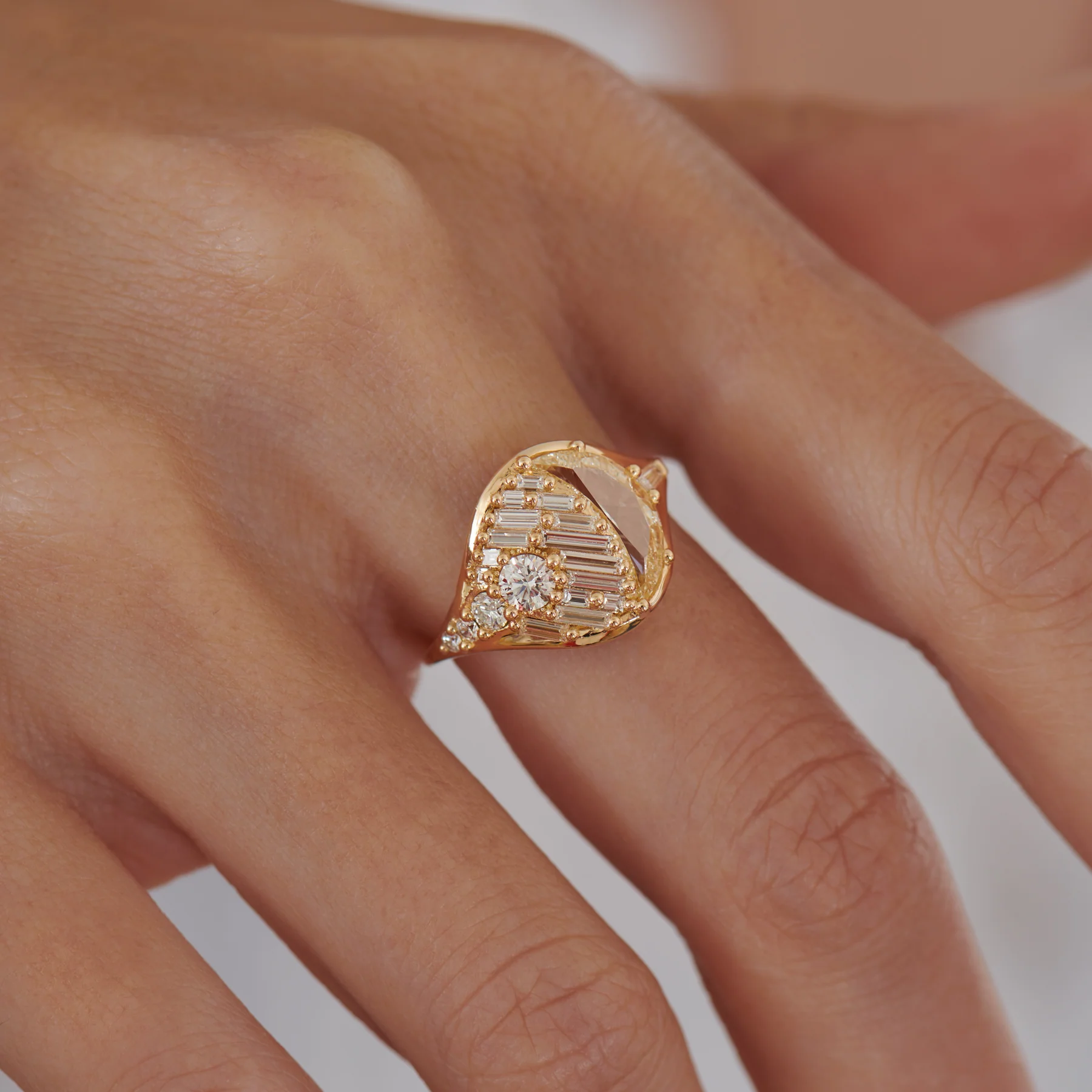 The Eclipse diamond engagement ring is handcrafted from 18K gold. A half moon diamond is set next to an assemblage of baguette cut diamond. Four brilliant diamond descending in size trail off towards the band. This celestial ring is sure to add a glow to any collection.Â