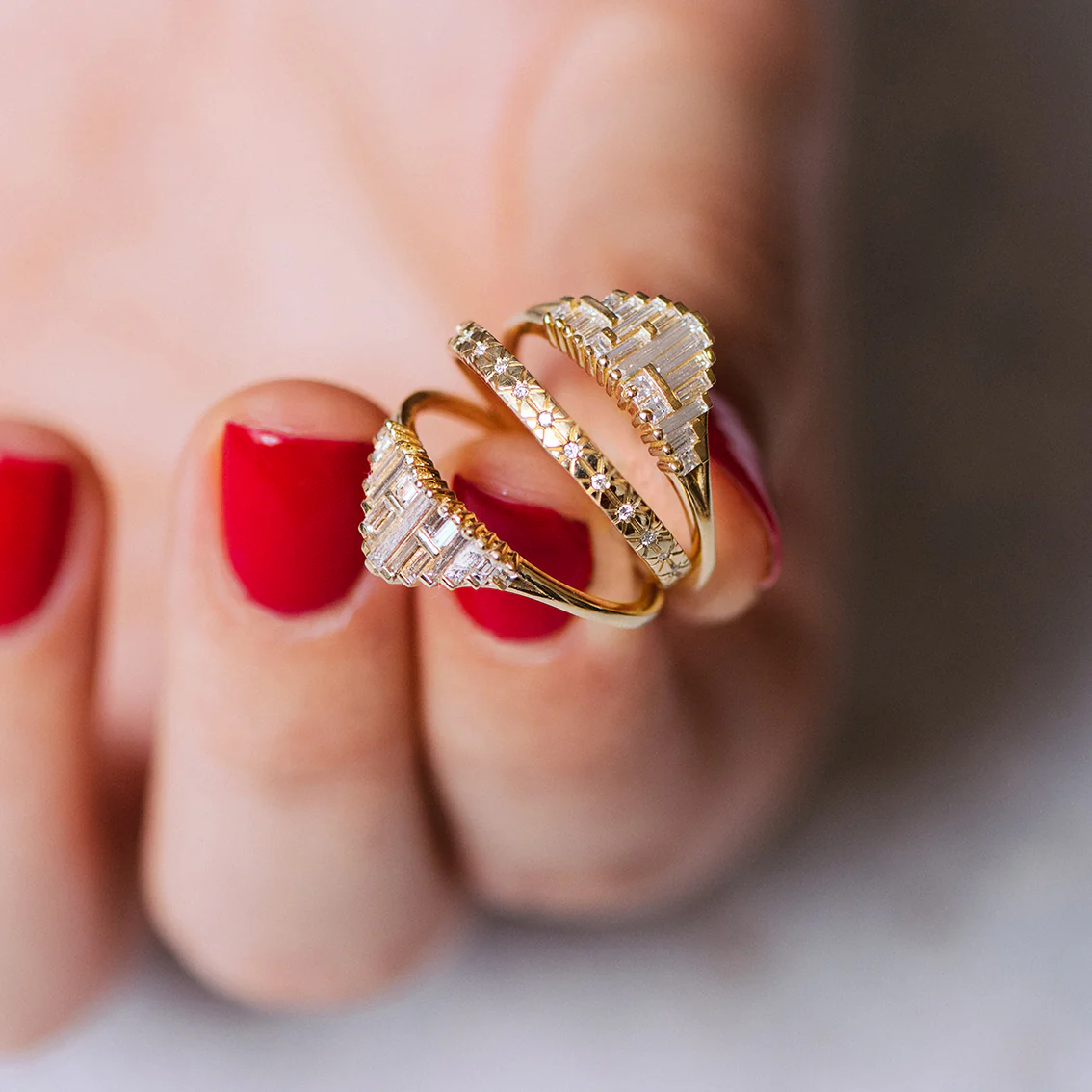 The engraved star diamond wedding band features a gold band with intricate detailing and round diamonds. This wedding band is absolutely stunning and ethereal.