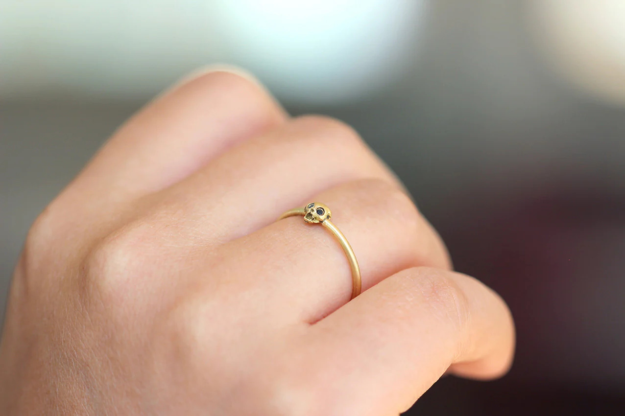 Dainty cat skull ring in 18k solid gold set with black diamond eyes.