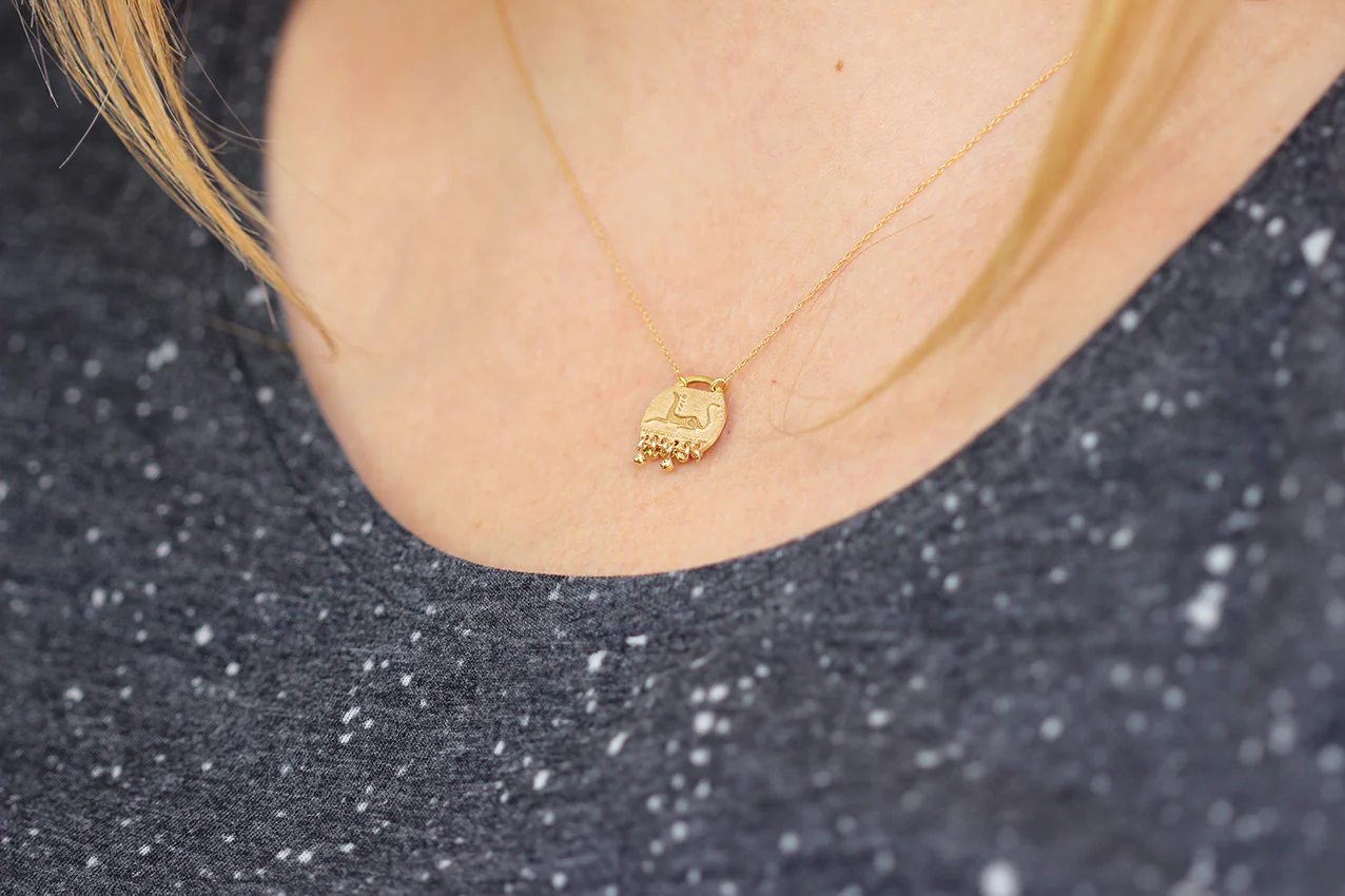 Gold hand engraved mythic animal pendant with necklace in solid gold with tiny gold dangles.