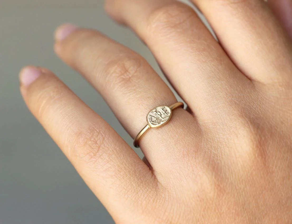 Gold signet ring in 18k solid gold with hand engraved Sagittarius symbol.