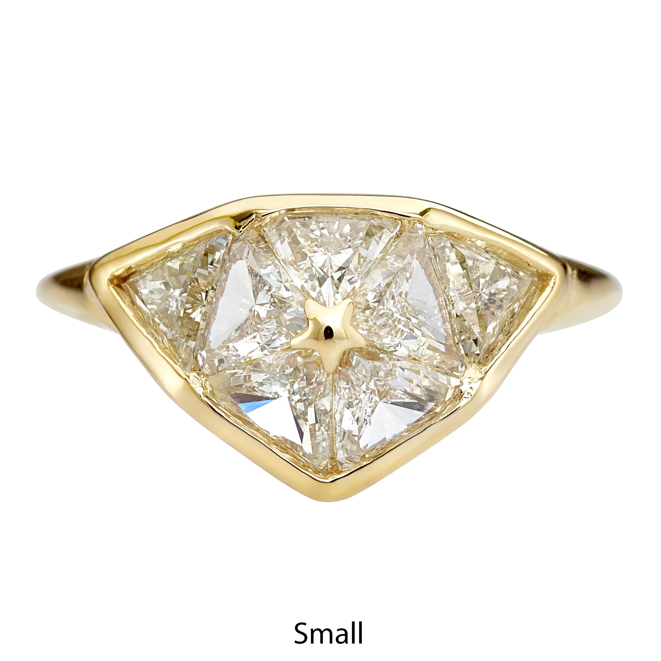 The Interstellar Dome Ring with Triangle Cut Diamonds will transport you through time and space with its modern and otherworldly design. This ring features 7 triangle cut diamonds that are skillfully set into a luxurious bezel setting. With only a golden star shinning through the center of the design, this modern take on an engagement ring defies the laws of physics.