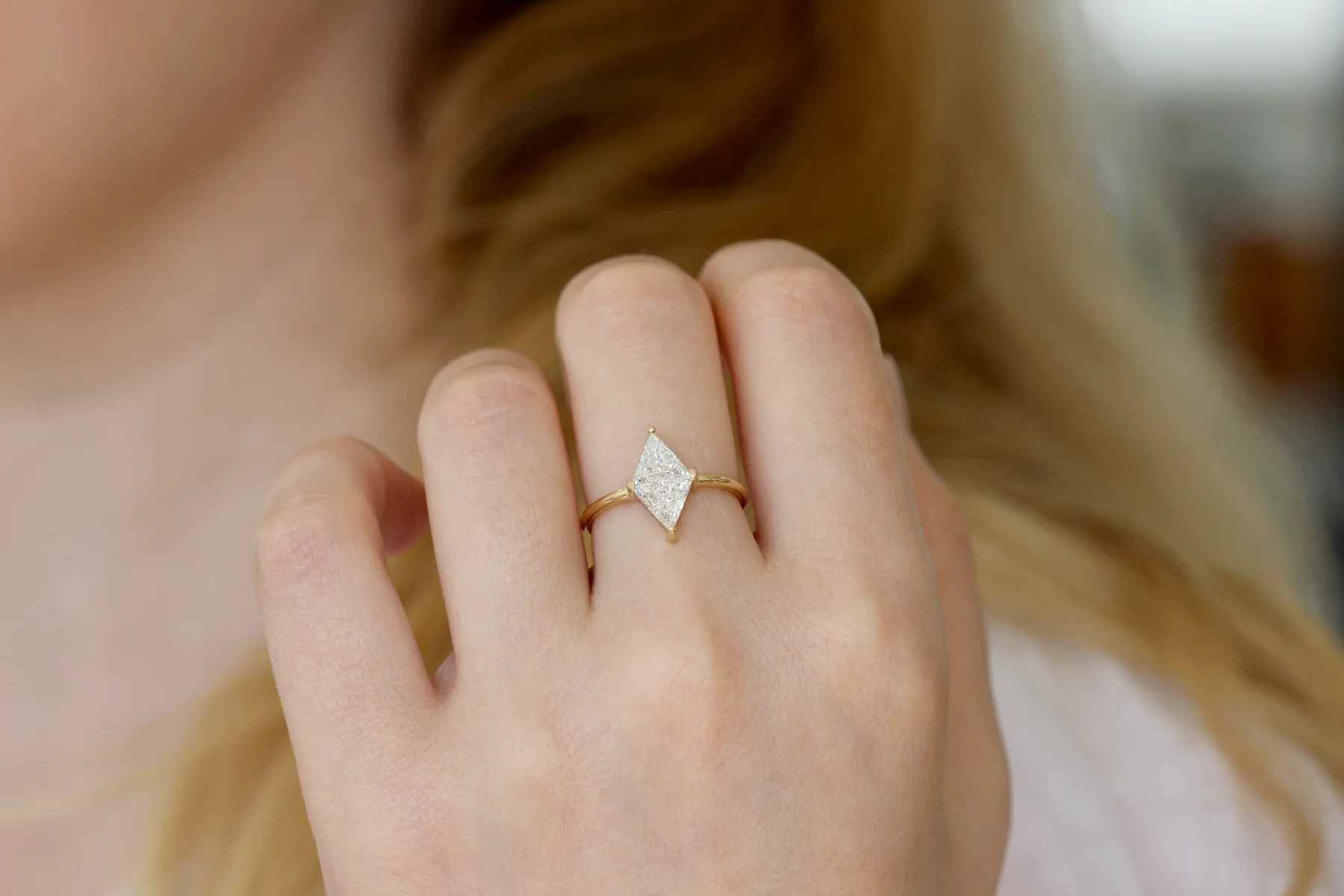 Rhombus diamond engagement ring set with two high quality triangle cut diamonds.