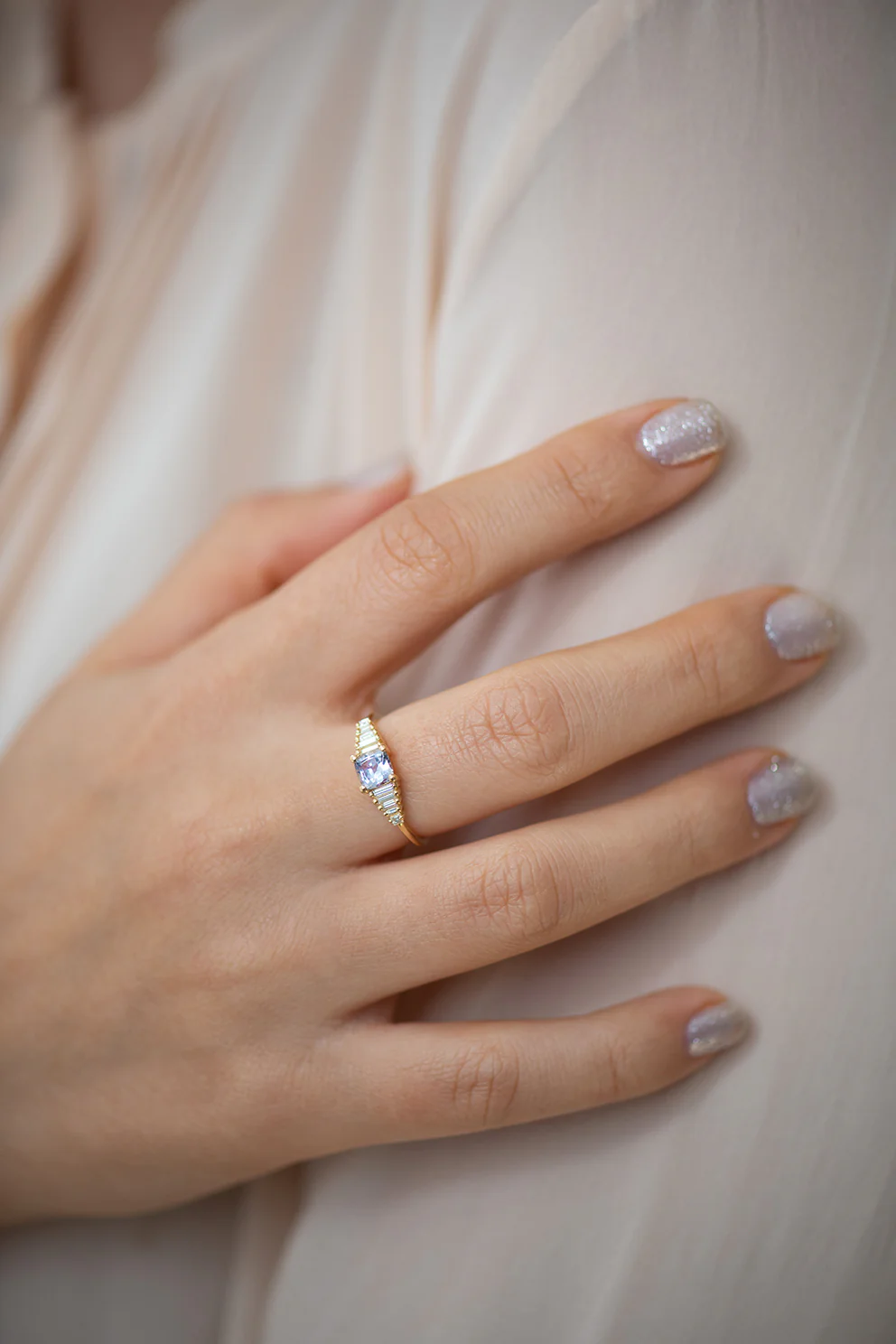The sapphire engagement ring with baguette diamonds features a vibrant and dynamic purple sapphire paired with the symmetrical gradient of baguette diamonds.
