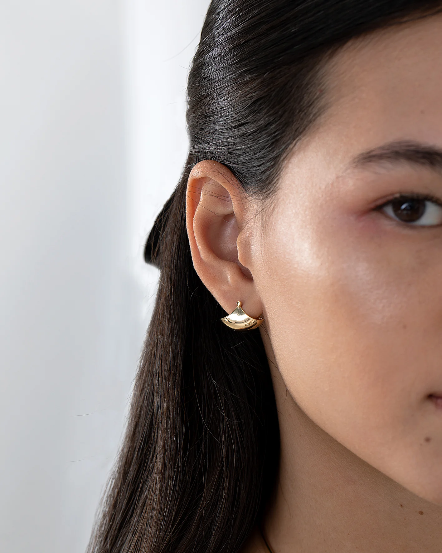 The Solid Gold Huggie Fan Earrings are handcrafted in our studio from 18K gold. Smooth polished gold fans out encasing your lobe giving the appearance it's made of gold. These earrings add a modern edge to any look.