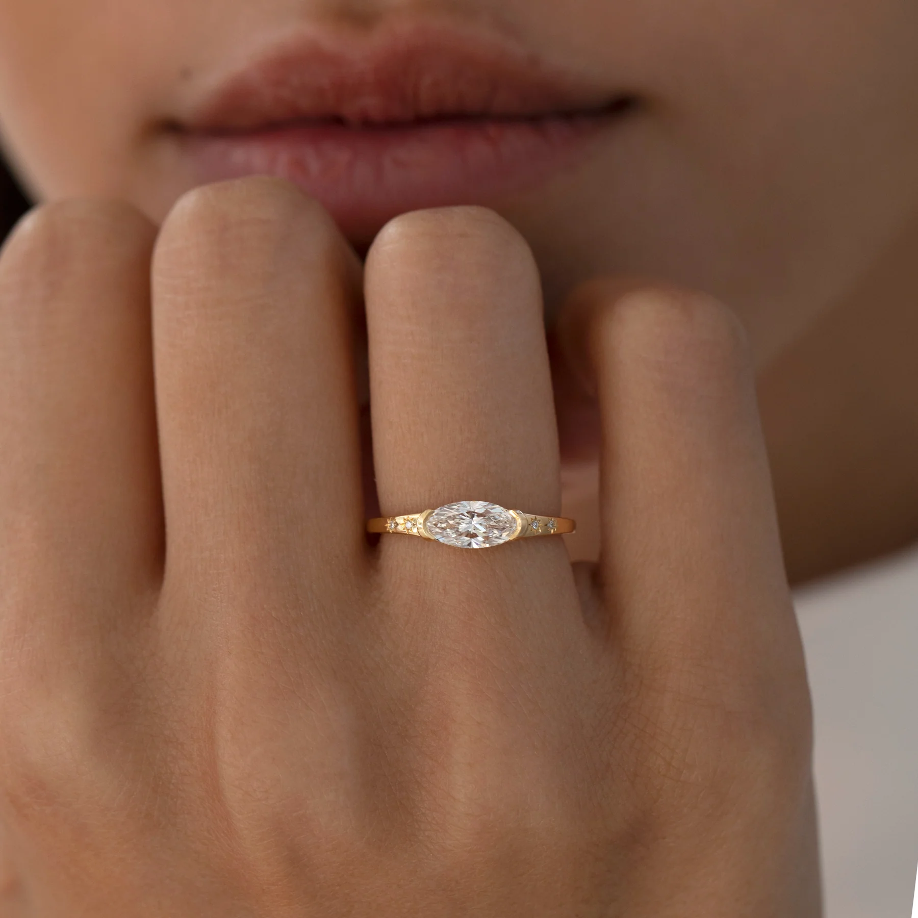 This Solitaire Oval Diamond Engagement Ring - Elongated Oval Diamond Ring - OOAK will lure you into the mystical power of the night. A luminous oval cut diamond is centered in between an engraved star pattern. Delicate and charming, this piece is perfect for those who want to add a touch of magic to their set.Â