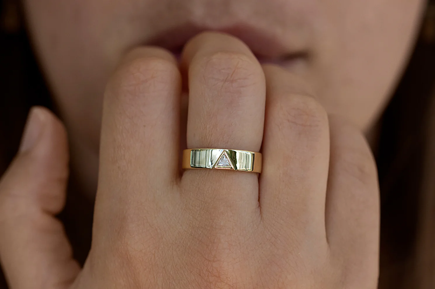 Flat 5 mm wedding band in 18k solid gold set with 0.10 carat trillion diamond.
