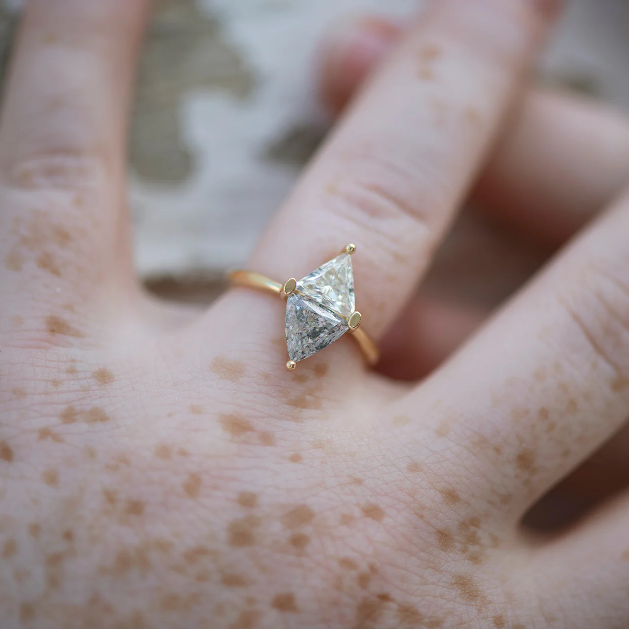 The two tone diamond rhombus engagement ring is sleek and brings a color blocked edge to the modern bride. This geometrical engagement ring is set with two stunning 1ct triangle cut diamonds, one grey and one white.